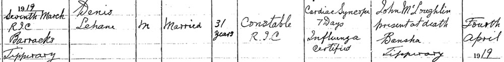There is only one possible Denis Lehane on RIC Register, but it is not him. 1886 Sep 22. Born Cork :1914 Nov 24 Married: 1907 Jul 1. Enlisted in RIC: 1907 Dec 17. Posted to Co. Tipperary: 1919 Mar 7. Died of Influenza
