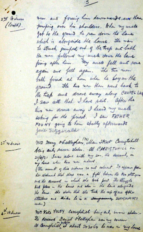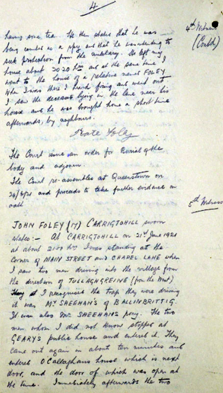 Thomas Cotter, a lieutenant in the Carrigtwohill IRA Company, later claimed responsibility for executing O’Callaghan as a spy. See Sheehan (2011), 76. Cotter named his associates in executing O’Callaghan as Volunteers Harry O’Brien of the IRA First Southern Division Engineers unit; M. McCarthy of E Company (Knockraha) of the 4th Battalion; and P. Mahony of Anngrove (Carrigtwohill). See Seámus Fitzgerald Papers, PR/6/32 (2), (UCC).