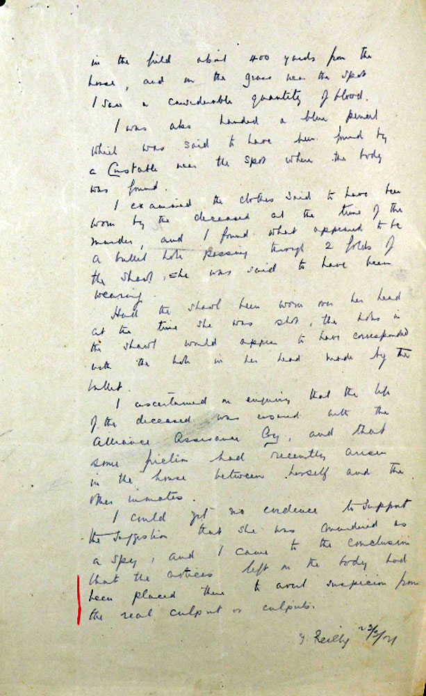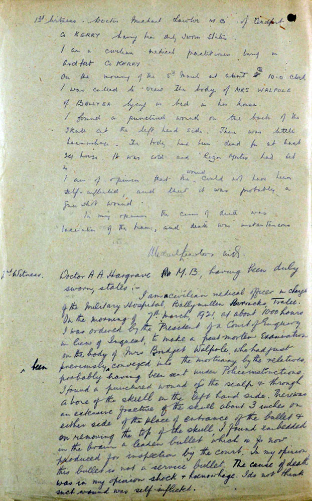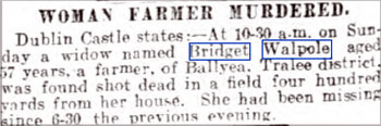 IRA Witness Statement A short time afterwards I came to Ballygarron, Spa, to the house of a man named Rail. There I was informed that a woman named Mrs.Walpole was found that morning shot dead on the side of the road with a label on her chest which read shot as a spy'. I knew this could not be correct as I had stayed at her house several times since I first went on the run. I investigated the matter and discovered that the shooting was the result of a family row.