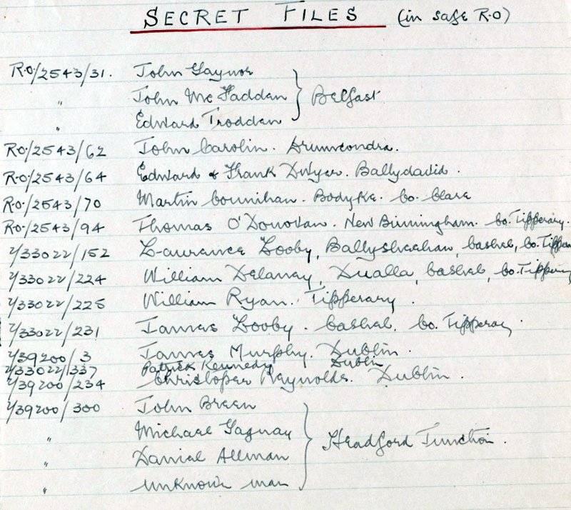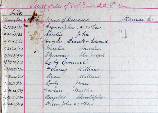 At the back of the inquest book is a page marked Secret Files. Examing these cases, one assumes that the British had something to hide