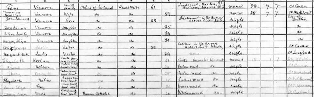1911 census at Wilton Place, Fitzwilliam, Dublin. His father clearly had a lot of money, and was "Land Agent, Banker & Railway Director"