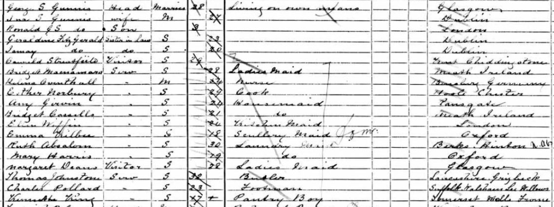 1887 Oct Born London. Father George Stuart Forbes Gunnis from Glasgow . Mother Jane Mary Josephine Fitzgerald from Dublin