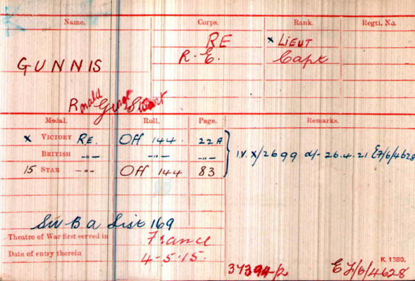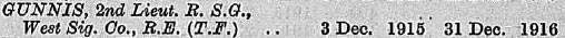 1921 Nov 2. R.C. of Sigs. — Capt. Ronald George Stuart Gunnis (late Gen. List and T,F.) to be Capt.