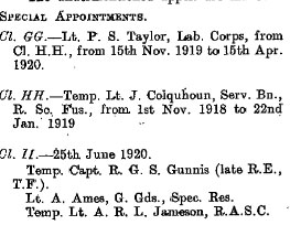 1920 Jun 25 Special Appointment . Capt. R. G. S. Gunnis, late R.E., T.F., to be temp. Capt. whilst specially empld. . A.Ames, who was shot on Bloody Sunday , is on same list. The other is ARL Jameson who is a mysterious figure