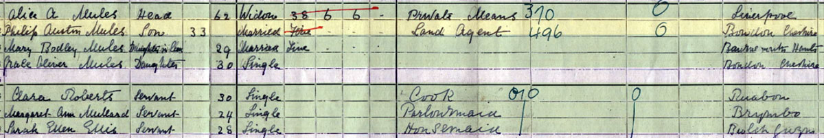 1878 Born Bowdon, Cheshire. Father: Philip Henry Mules Mother: Alice Anabella Mules