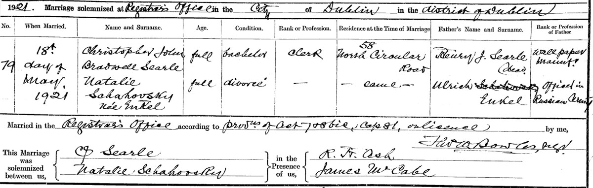 1921 May 18. Married in Dublin to Natalie Enkle