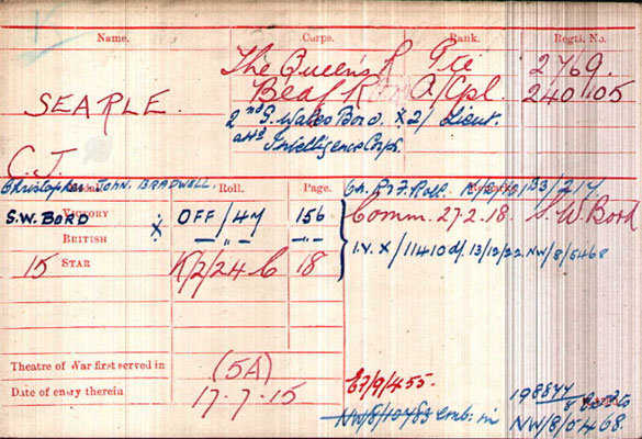 1922 Mar 27. S. Wales Bord. —The undermentioned to be Lts.: —. Lt. Christopher John Bradwell Searle, late Spec. Res. 27th Mar. 1922, with seniority 1st Nov. 1919