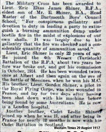 1915 Jul 29. RFA Wessex Brigade; Second Lieutenant Eric E. J. Shiner to be temporary Lieutenant.