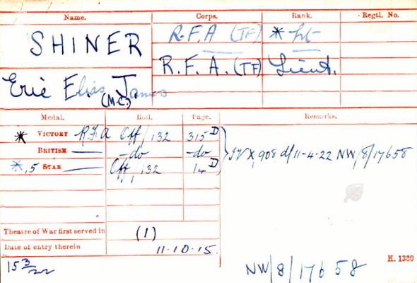 1919 May 10. Restored to the estbt. of the R.H. and R.F.A. (T;F.).: — Lt. E. E. J. Shiner, M.C., 4th Wessex Bde.
