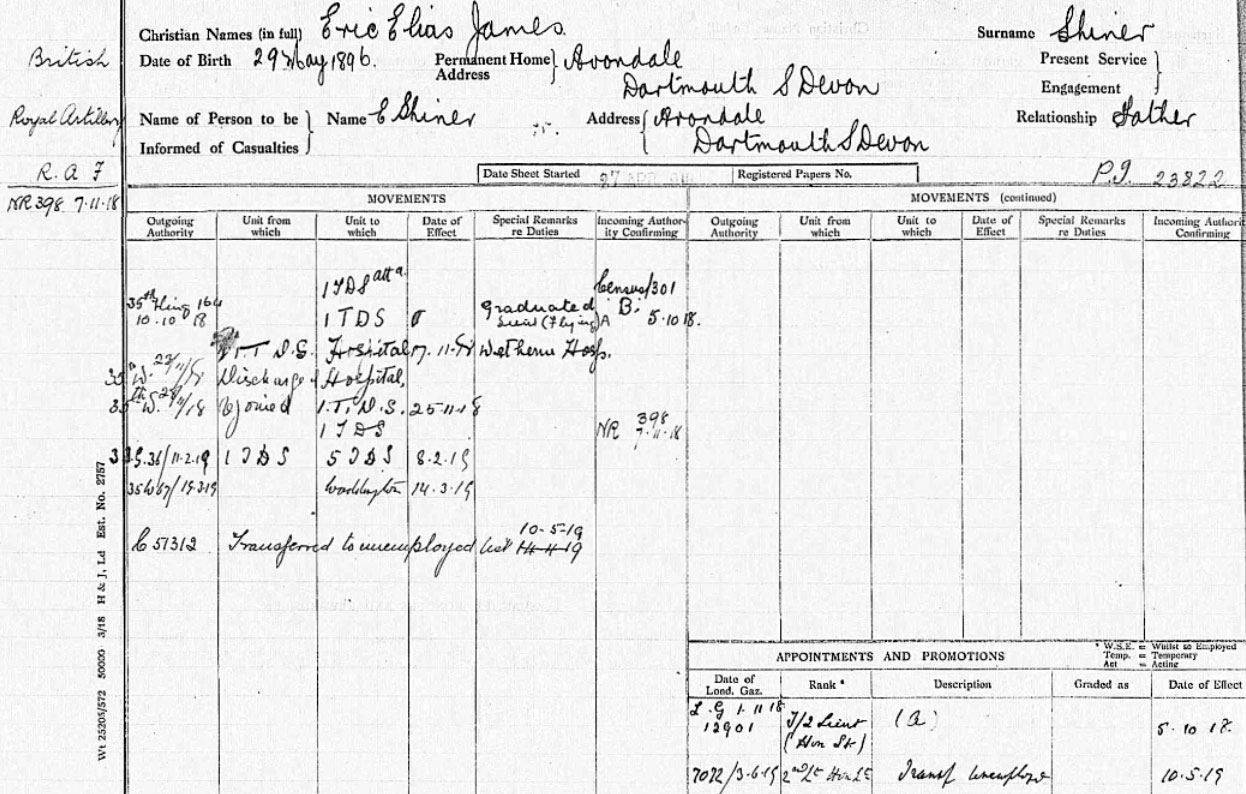 1918 Oct 5. RFA - Seconded to RAF. Lt. E. E. J. Shiner, M.C.,