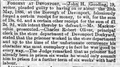 1886 Jul 24. His first term in prison; six weeks for forgery whilst working as a clerk in a store serving Devonport Dockyard. He was granted leniency as he had a young wife and child.