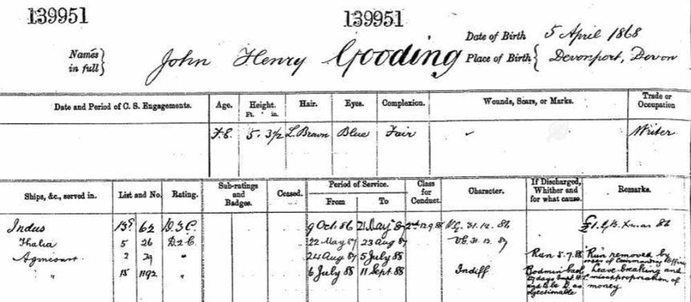 1868 Apr 5. He was born John Henry Gooding in Devonport, the only son of John Rowcliffe Gooding (1837–1908) and Elizabeth Ann Furzeland (1849–1875), although he would later have four half-siblings through his father's remarriage in 1877.