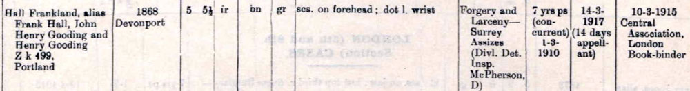1896 Apr 5 . Larceny & 2 counts of Forgery - 12 Months Hard Labour (as Frank Hall)