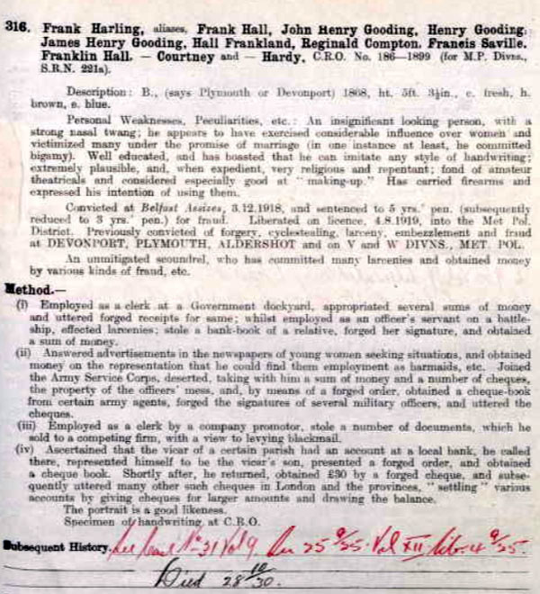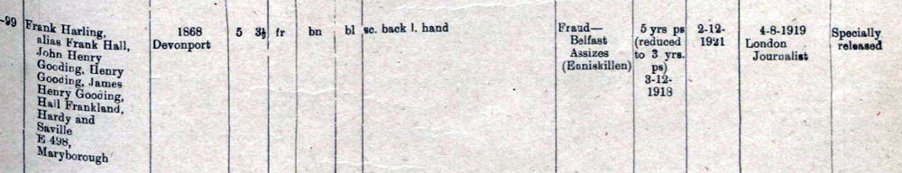 1918 Dec 3 • Enniskillen Assizes, Enniskillen, County Fermanagh, Ireland 5 year's Penal Servitude for Fraud (reduced to three) (as Frank Harling)