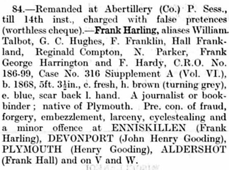 1921 Nov 09 Arrest • Abertillery, Monmouthshire, Wales False Pretences - Worthless Cheque (as Frank Harling)