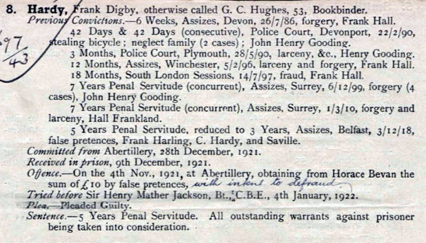 1918. Hardy married for the third and final time to Annie Parker (1894–1980) in Wolverhampton under the name Frank Digby Hardy; the couple had four children. Annie Hardy accompanied her husband to Ireland in 1918 where, under the names A. G. Saville and Frank Harling, he conducted numerous frauds and confidence tricks which led to his arrest and conviction under Justice Gordon in December 1918. Initially sentenced to five years' penal servitude, his sentence was later reduced to three years in January 1919.