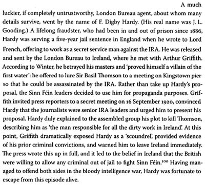 1920 Aug 12. A convicted forger serving a 5 year sentence in a London prison, one F. Digby Hardy, offered his services as a spy. Hardy was to travel to Ireland and establish contact with the IIS. Hardy's letter, however, had been intercepted and transmitted to IIS Headquarters, where Irish operatives began to amass a dossier of incriminating information concerning Hardy's past. Collins actually got a copy of the letter Gooding wrote offering his services.