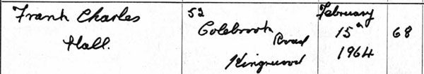 1. 1964 Feb 15, I am left with the loose end of the Death of Frank Charles Hall of 52 Colebrook Rd, Kingswood, Bristol with an implied date of birth in 1896 . He could be the Frank Charles that has been raced from 22 Dec 1895 birth