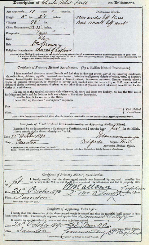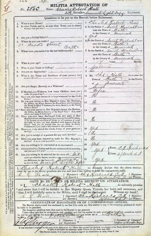 1890 Oct 24 Enlisted in Somerset Light Infantry Militia. Paid 1 pound to get a discharge 26 Nov 1890