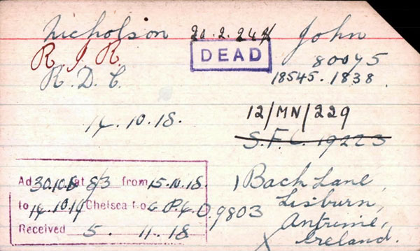 The military service of his father John . His pension record card via Fold3 which shows that he was living at 1 Back Lane, Lisburn, and gives his army service numbers.