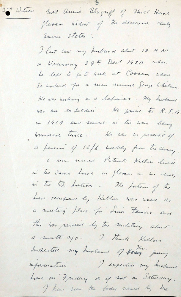 IRA Witness Statement Around January or February 1921, a man named Blagriff was shot at Ballykieran crossroads. This man was going to join the Tans, having passed the medical examination for them. He told his employer about this while under the influence of drink. The boss gave him some more whiskey and talked further to him. He discovered that Blagriff knew all the local Volunteers, as he had worked for a considerable time in the area. He had always been more than friendly to the Volunteers. With the knowledge he had he would have been a dangerous man to allow to join the Tans, and it was decided he would have to die. When we held him up prior to shooting him, he would not admit anything. The police and military raided the area extensively after Blagriff's shooting and ill-treated his boss severely because he would not supply them with information about the men who shot Blagriff