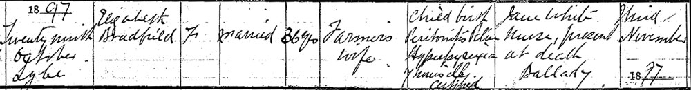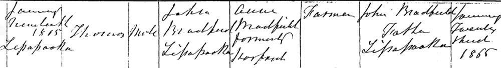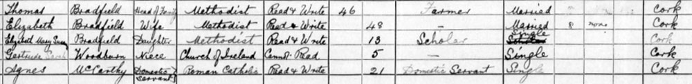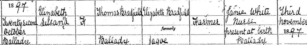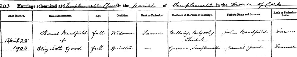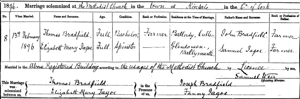 1865 Jan 19. Born Bandon Dispensary, Co Cork son of John Bradfield and Anne Holsford