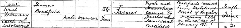 1918 May. The Irish Revolution cites Tom Bradfield as being the man that shot Michael Crowley in 1918, but I cannot tie this Tom Bradfied to the undoubted shooting of Crowley. I cannot find a press report