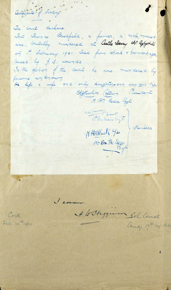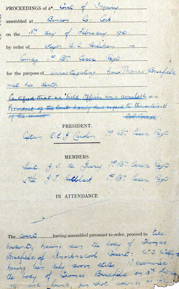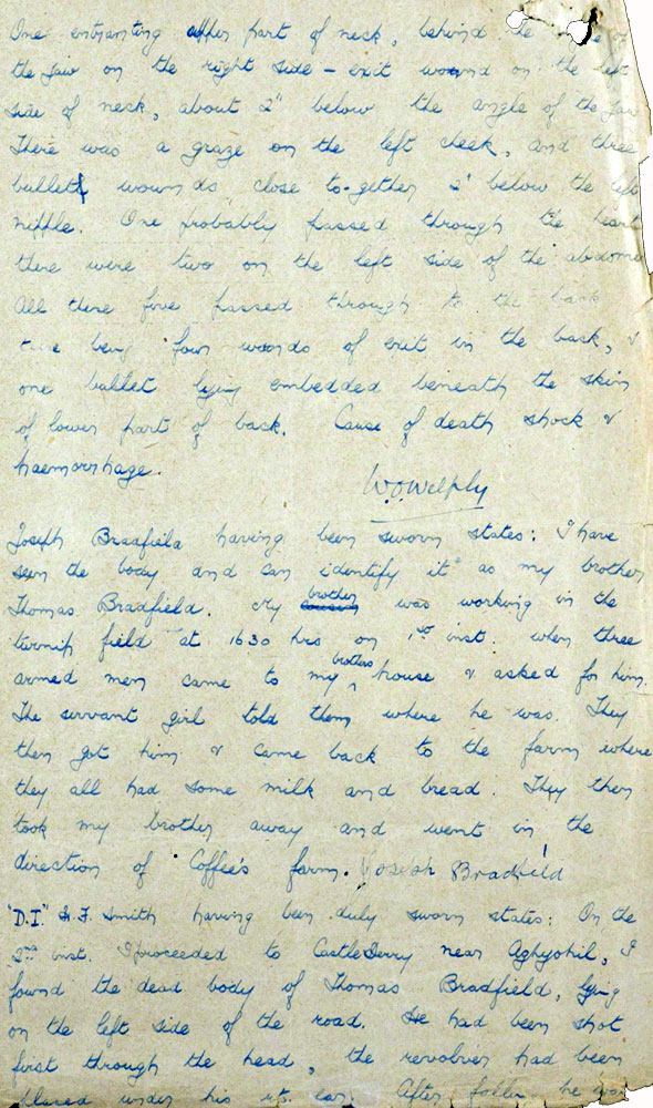 IRA Witness Statement While in billets in Ahiohill reports from the I.R.A. Intelligence Section caused investigations to be made in connection with a farmer named Bradfield who resided in the district. As a result of the investigations it was found that this man was a British spy. He was arrested, courtmarialled, found guilty and sentenced to be shot. He was executed on Tuesday night, lst February.