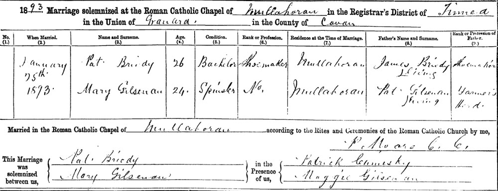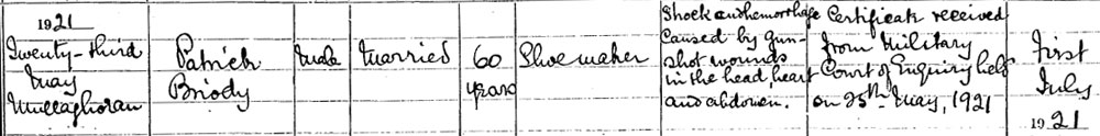 On Tuesday the 24th of May 1921 at about 2am Patrick Briordy (Briody), a shoemaker, was shot dead outside his home at Mullahone about 10 miles from Cavan. At about 12.45am 30 men took Broady from his home and shot him about six hundred yards from his home, he had seventeen bullet wounds in his body, a note attached to his dead body read ‘Spies and informers beware, I.R.A.’ Broady leaves a wife and family.