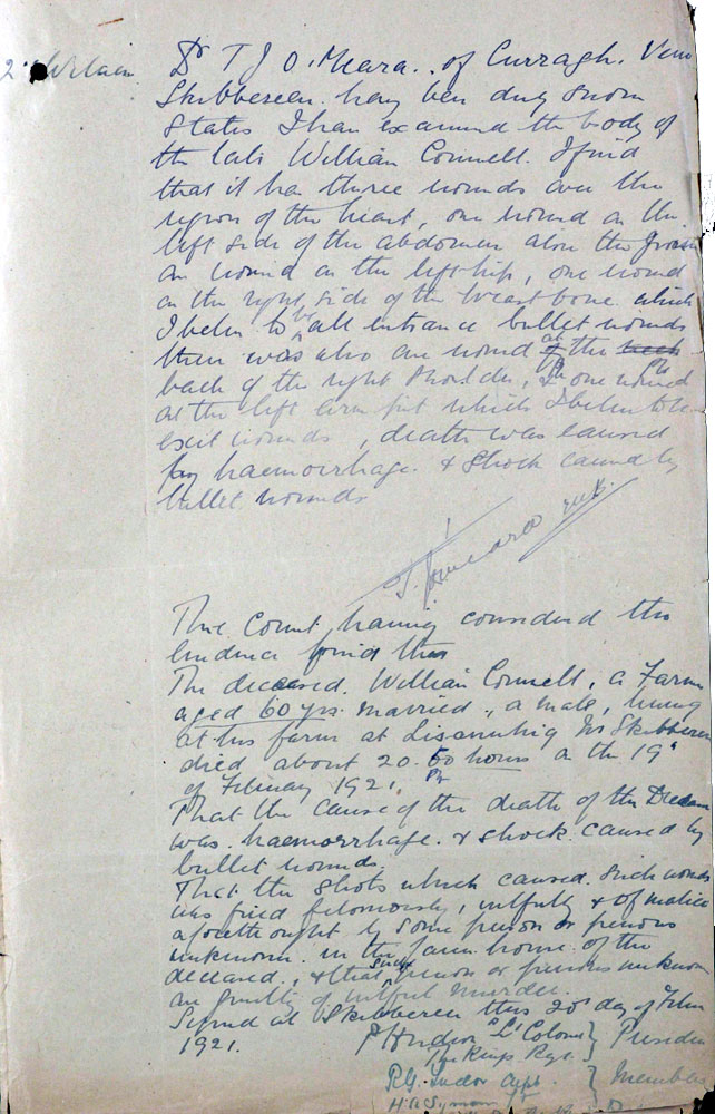 IRA Witness Statement Early in February 1921,orders were received from Brigade Headquarters that two Protestant farmers in the Skibbereen area Connell and Sweetman should be executed and their lands forfeited. These farmers had informed the British of the names of the men who had called on them to collect the Arms Fund levy. About this time the Column, under the 0/C.(TomBarry),arrived in the area. It was decided to make arrangements to carry out the Brigade order in the hope that the enemy forces in Skibbereen would move out into the area to investigate the shooting of the two men,and so enable the Column to ambush them.The Column moved into billets.Some local men were selected to take up duty as guards on the homes of Connell and Sweetman until the ambush position had been selected. Amongst the men selected was Patrick O'Driscoll (Mohanna Company). When being detailed for duty,with anothe I.R.A. man ,Patrick O'Driscoll was shot accidentally. As a result the Column withdrew from the area,and at night Tom Barry moved into Skibbereen with the Column.The attack on Skibbereen is described in "Guerilla Days in Ireland " (Tom Barry) chapter 14 pages 87- 95. Patrick O'Driscoll was shot on the night of 8th February 1921.Sometime early in March,1921, Connell and Sweetman were executed. Following their execution my father's house, together with those of Cernelius Connolly (now Battalion 0/C) and John McCarthy, Mohanna, were burned as reprisals by enemy forces