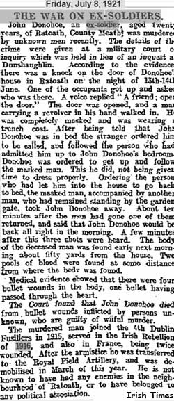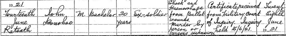 The British Inquest exists in TNA - WO 35/149A/28 Description: Death of John Donohoe; 14th June, 1921; Ratoath, County Meath. - but I cannot find it in Ancestry images.