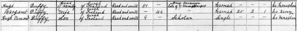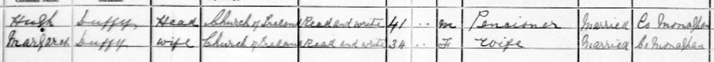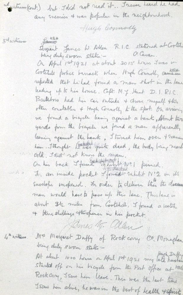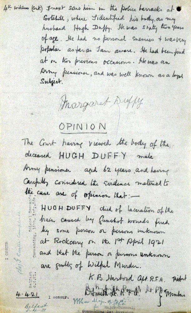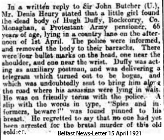 IRA Witness Statement .One night Jennie Kelly, BobHamill and myself were on guard on a nearby road.A patrol of "B" Specials came along. Hugh Duffy was apparently an advanced guard for this patrol. It was a fairly dark night and Duffy nearly got past where we were standing before we noticed him. We ordered him to halt and he immediately opened fire on us.We replied vigorously to his fire. I can't understand since how Duffy missed Bob Hamillon whom he first opened fire, nor can I explain how he escaped from us returning fire. Duffy zig-zagged back towards the main patrol of "B" men. The patrol made no effort later to approach our position....... I would like to mention a few of the Rockcorry "B" men who were particularly active against the I.R.A.: Hugh Duffy, Jack Francey, Bob Harrison and a man named Harpur. Those men held up my brother Ned one night. Ned dared them to search him and they did no do it. Duffy later on gave information to the Tans whichr esulted in several I.R.A. men's arrests. An order wa sgiven for Duffy's .liquidation which was carried out about June 1921