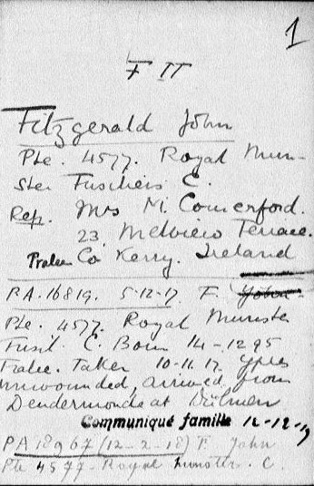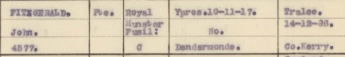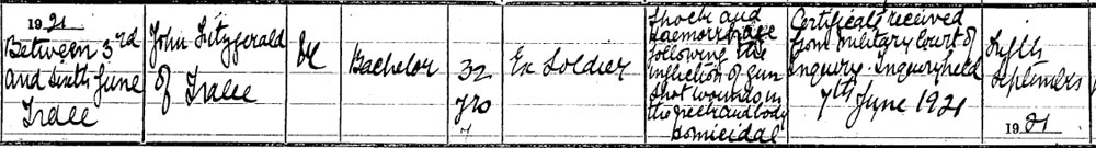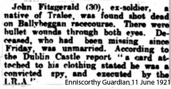 IRA Witness Statement At the time of my arrest subsequent to the shooting of Benson, while in the County Jail I met one of our mena man named George Nagle who had been arrested sometime earlier. Nagle informed me that an ex-British soldier named John Fitzgerald had pointed him (Nagle) out to the Tans as an I.R.A .man. Apart from this our scouts had him under observation and were aware that he had been helping the Tans. for some time. Nagle's story was the first definite proof we had of Fitzgerald's activities .I reported the matter to the Battalion Commandant , Michael Doyle, and to the Brigade 0/C. He was courtmartialled .An order came from the Brigade 0/C to shoot him. I conveyed the order to the Battalion Flying Column. Fitzgerald was duly executed at Ballybeggan Racecourse on the 6th June, 1921.