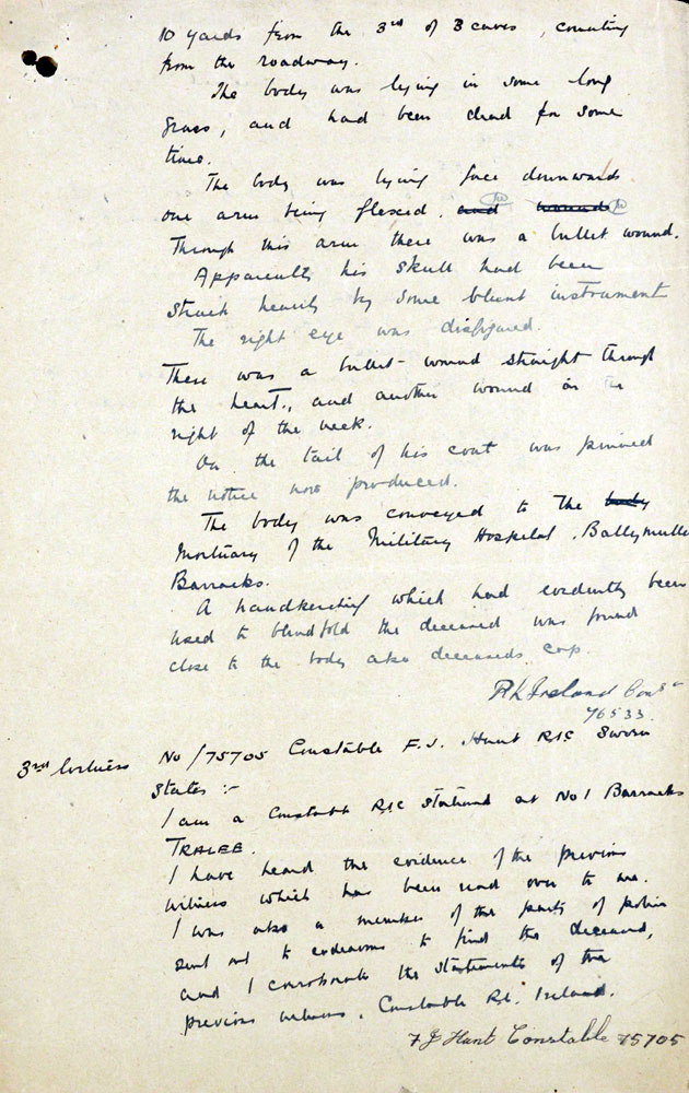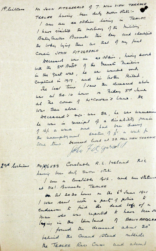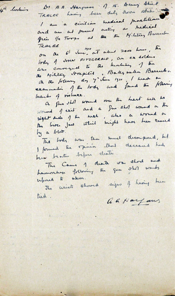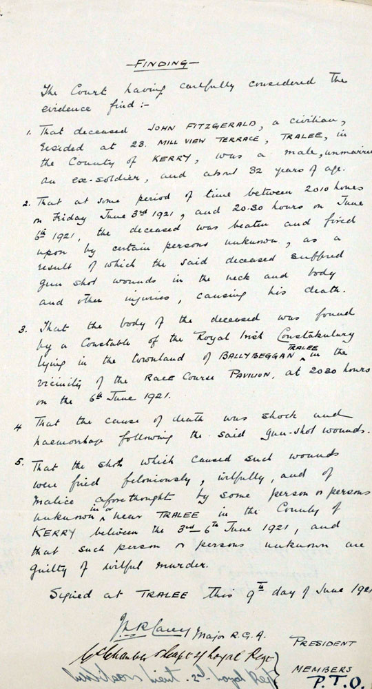 IRA Witness Statement Early in June, 1921, John JoeSheehy sent for Michael Sheehy, ThomasBarrett, Pat Cantillon, Percy Hanifan and I and told us that an ex-British soldie rnamed John Fitzgerald was to be arrested and tried by courtmartial as an agent of the enemy. Fitzgerald had been under suspicion for a long time but nothing definite could be proved against him. The Brigade Staff had at last received definite information that he had identified certain men to the Tans as being members of the I.R.A. and had issued the order for his arrest and Courtmartial. Michael Sheehy, Barrett, Cantillon, Hanisanand I arrested Fitzgerald in front of Path Churchyard on the night of 6th June,1921, took him through the graveyard to Ballybeggan racecourse. He resisted arrest and very nearly escaped. He was recaptured, however,and handed over to members of the Battalion and Brigade Staff. who were awaiting us on the racecourse. John Joe Sheehy presided at the Courtmartial which was held on the spot. After evidence of the supply of certain names of members of the I.R.A. and other information relating to the activities of the I.R.A. generally, by the prisoner to the enemy, had been furnished to the Court, Fitzgerald was sentenced to death.John Joe Sheehy took charge of the execution which was carried out there and then. The men taking part in th eexecution used revolvers. The body was labelled "Spy": .The exacution took place on a Friday night but the body was not found until Monday evening.