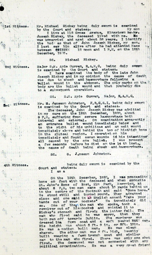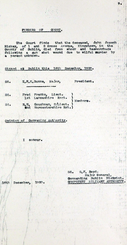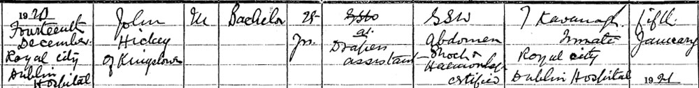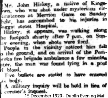 I am trying to find some information on a Volunteer named John Hickey who was shot dead on Sunday 12th December 1920 by men in civilian clothes who approached him and a friend at Merrion Gates in Dublin. He died in Baggot Street Hospital on Tuesday 14th and was buried Sunday 19th in his native Dun Laoghaire. He seems to have been left out of any accounts of the WOI left by members of the IRA in South County Dublin. With your knowledge of this period would you possibly be able to point me in the right direction in terms of where to look for info on Hickey. I tried Kew Archives for his inquest but alas to no avail. Any help much appreciated. Kind Regards, James Brady