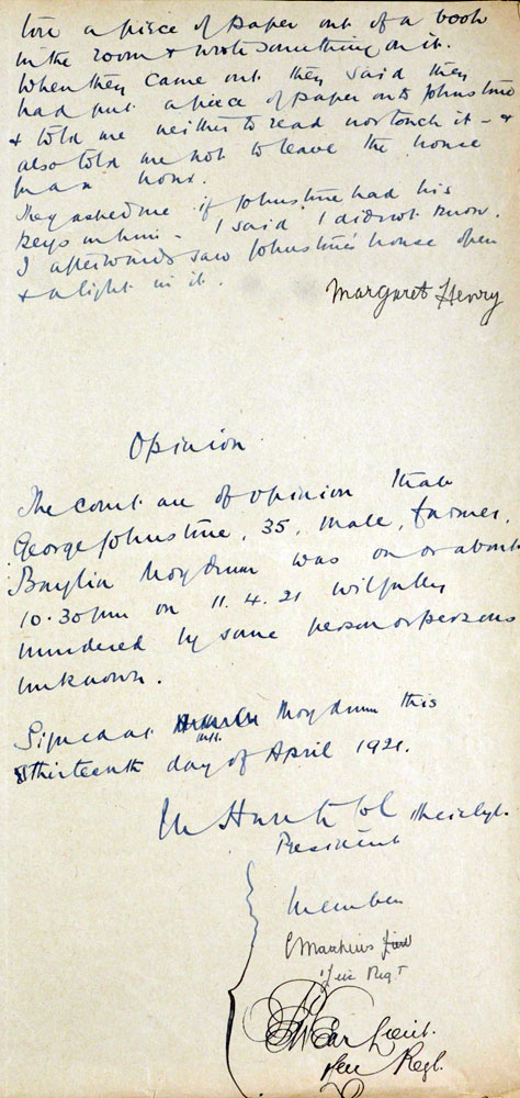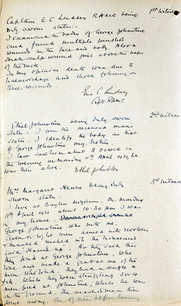 IRA Witness Statement Another man named Johnston was shot as a spy. This man was a Protestant in religion. He had been a gamekeeper in earlier years and, as such, was responsible for a number of prosecutions against individuals. He actually fired at some of our men one morning. His place of residence was at Baylinn about four miles from here and knew all around this area very well. When our men went to get him, I understand he put up a desperate fight to escape. He was shot in a house next door to his own house and then taken some short distance from the house and labelled that he was executed for spying. I cannot give any actual details as to his guilt, but it was accepted by everyone without question that he was a spy, and it was further understood that he was the principal enemy agent in the county