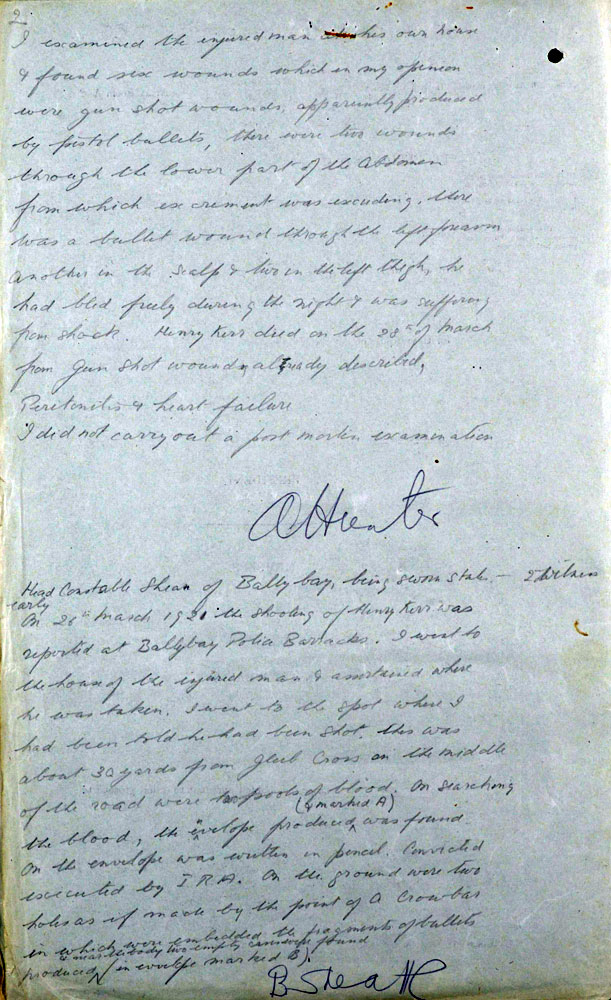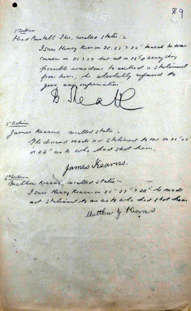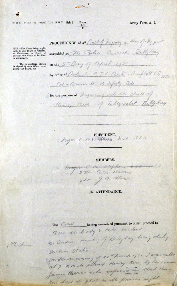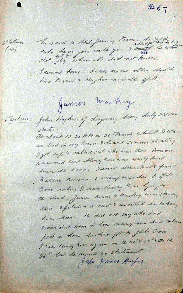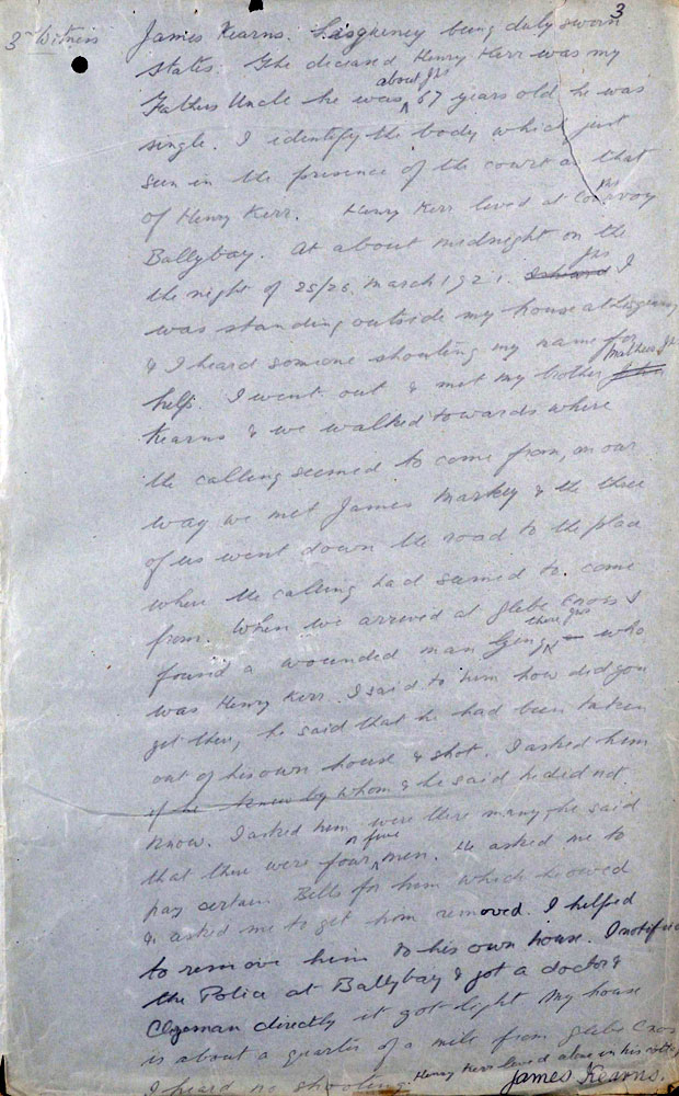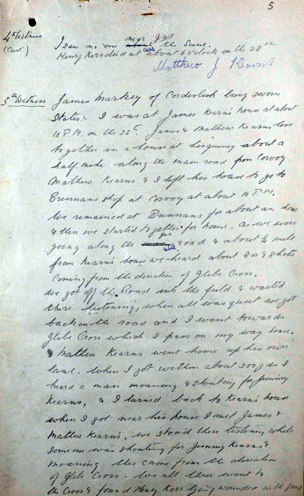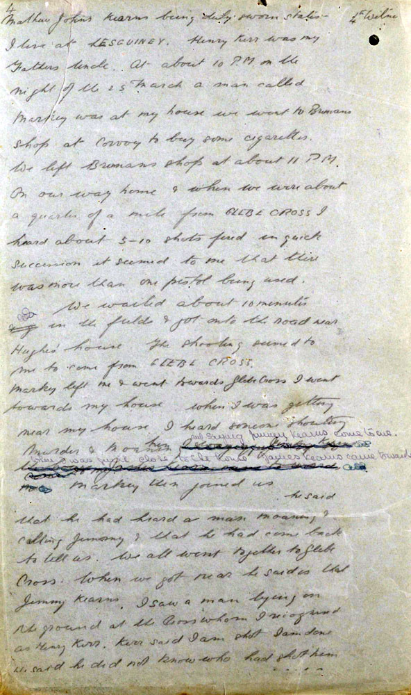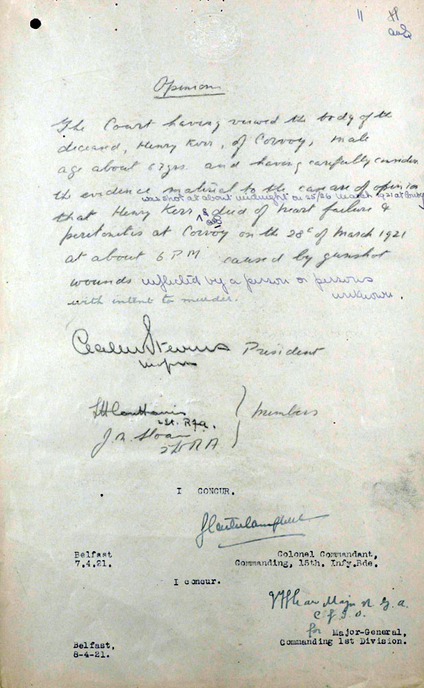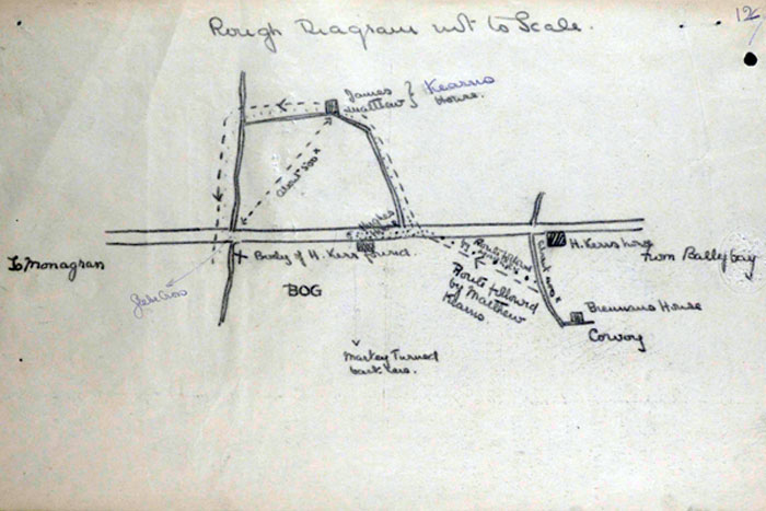 IRA Witness Statement Our Intelligence, about mid March, 1921, intercepted. a letter passing through the post, addressed to the 0/C .Military Barracks, Monaghan, in which the writer, a man named Harry Carr, stated that there were a number of other members of the Tullycorbett Company who should be arrested. We sent a few Volunteers to interview this man, posing as British military. Carr was asked how he could be so definite as to who were members of the local Company. He took his visitors to the door and showed them the Volunteer Drill Hall a short distance from them and said, "Many a night I was there peeping through the window when drilling was taking place". This man a was shot as a spy on Good Friday night 1921.