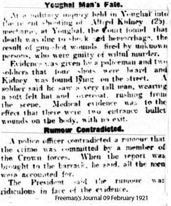 The Crown seem to have gone out of their way to demonstrate that this was an IRA killling. The County Inspectors report said that Kidney had been suspected of giving information about the IRA to the military. See RIC County Inspector’s Report, Cork City and East Riding, Feb. 1921 (CO 904/114, TNA). In addition a pevious attempt had been madeto kidnap him