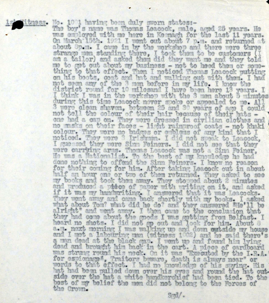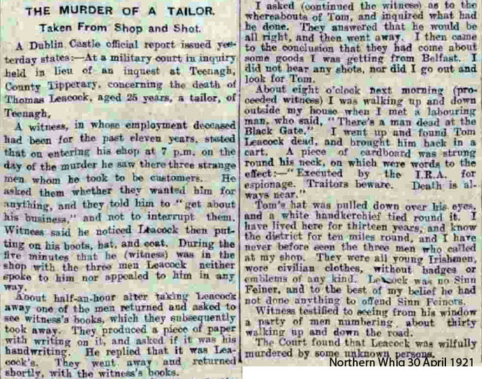 It is believed from a taped interview quoted in Coleman - Longford and the Irish Revolution, that the IRA had found evidence of Leacock sending information to the British, when the IRA made a number of raids on the mails.One can see from the British inquiry that the men who picked Leacock up were interested in his handwriting.