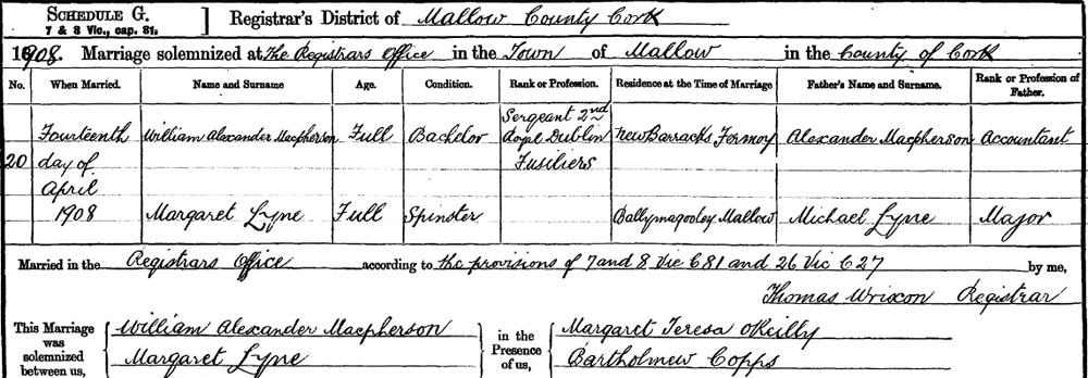 1908 Apr 14. Married Margaret Lyne in Mallow. He is a Sergeant in 2nd Bat. Royal Dublin Fusiliers