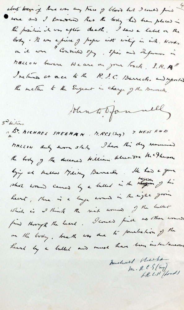 IRA Witness Statement About mid May,1921, accompanied by Jerry Hanlon I drove into Mallow in a pony and trap to arrest a suspected spy named McPherson. We called to a barber's shop in Bridge St. adjacent to McPherson's house. We went into the shop to await a report from the intelligence section as to the whereabouts of McPherson, but before the information reached us we were warned by a membe of Cumann nam Ban to leave the town immediately as the military were aware that we were in town. We left the town without delay and only barely evaded the enemy party which was sent to look for us. McPherson was later taken prisoner in Mallow by three unarmed members of Dromahane Company (Denis Barrow and two others). He was taken to Dromahane where he was detained until he was tried that night at a meeting of the Battalion Staff. He was found guilty of spying for the enemy and was sentenced to be shot. The findings were confirmed by Brigade H.Q. and the sentence was carried out the same night on the Fiddane road about 11/2miles from Mallow. This was, I think, the week before the Truce.