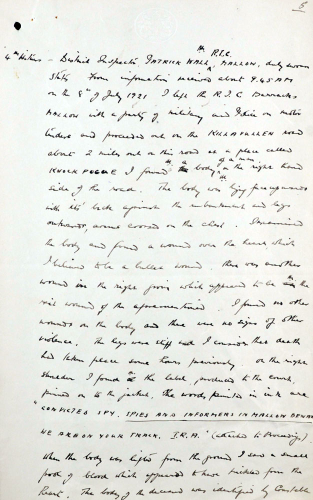 His body was found at Knockpogue with a bullet in the chest and with a label declaring ‘Convicted spy, spies and informers in Mallow beware, we are on your track, I.R.A.’