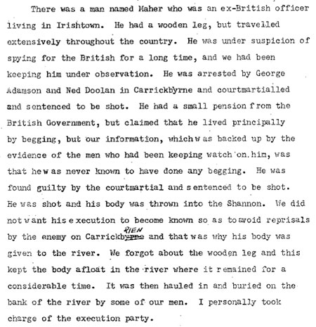 IRA Witness Statement, Westmeath A man, whose name I do not know, but who was known as 'Slickfoot', was shot as a spy in the Carrickbrien area. He had a cork leg and that was the reason he was called 'Slickfoot'. When he was shot he was thrown into the river, but the cork leg made him float, so he had to be weighted down with sandbags. I don't know anything about his guilt except that he was shot as a result of something that was discovered in a raid on the mails.