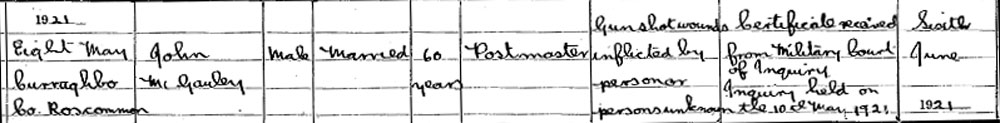 The bodies of both of the executed men were taken to Roscommon where some sort of Inquiry or inquest was held by the British authorities. Subsequently, when their funeral was taking place, the Tans and R.I.C. went along the route of the procession in Roscommon and compelled the people to close their Shops and draw the blinds on the windows. The two men were buried locally by their own people. Extensive searches were carried out by the British in the area after this, but without any result. No further information was supplied to the enemy after that from that area.