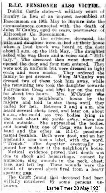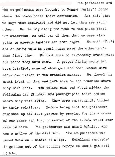 This second prisoner was the local postmaster, who was also being taken to see the priest. The ex R.I.C. man, Scanlon, on hearing me give instructions to the second party as to where they were to go, said, "Is that another one, Frank?". "It is", I said. "Who do you think it is?" "Would it be John McCauley?", he replied, and I said, "Correct, first time!". McCauley was the postmaster. Some short distance further on, we met another party of our men with a third prisoner, a lady this time. - She was a daughter of Scanlon. Scanlon now asked me if that was another one and I said, "Yes". He then remarked, "You must be going to make a clean sweep of them to-night". I said that after tonight there would be no information for the enemy in this parish. The two men were taken to Kilrooskey and, about a quarter of a mile on the Beechwood side of it on the road leading to Roscomnion where a trench had been cut across the road, they were executed by shooting. The usual label, "Spies And Informers, Beware!", was placed on their bodies which we left on the side of the road. The lady was tied to the gate outside Kilgeffin church. I understand she was released in the morning by someone who was going to early Mass which was at 8.30 a.m.