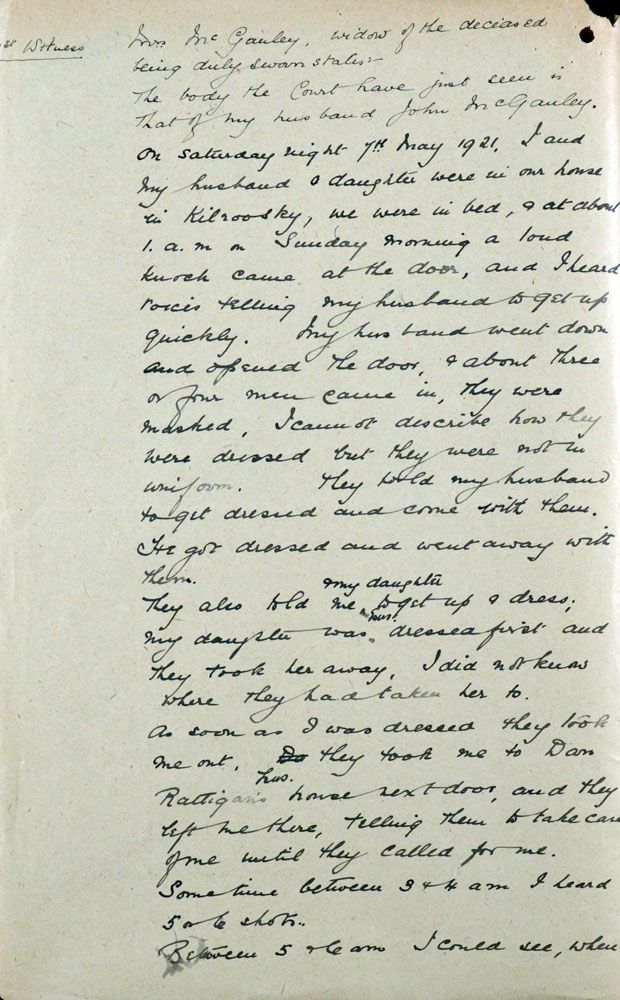 The following morning; enemy forces consisting of military, police and Lancers from Strokestown surrounded the area which he had declared would be safe. This area comprised the townlands of Ballincurry, Ballinvolly, Carrowmoneen, Aghamuck and Fairymount, all of which were given special attention. There was not a bush or a crevice of any size or description that they did not fire into and they used up some thousands of rounds of ammunition in combing the area. They took everyone of military age, both male and female, and brought them to a cottage at Beechwood where they were required to parade past a window. Some local individual who knew the people of this area was apparently inside for the purpose of identification. They got none of the men they were looking for. The ex R.I.C. man's home was kept under observation for a considerable period at night time.