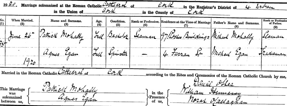 1920 His brother Patrick marries in Cork. Note that this ties a number of things together. It is the same address as Patrick in the inquest is living at, 4 Farrar Street. and hence shows William's father is Michael Mohally of Roches Building
