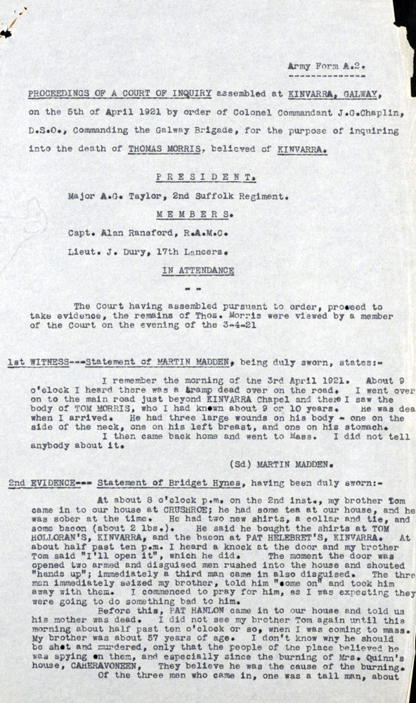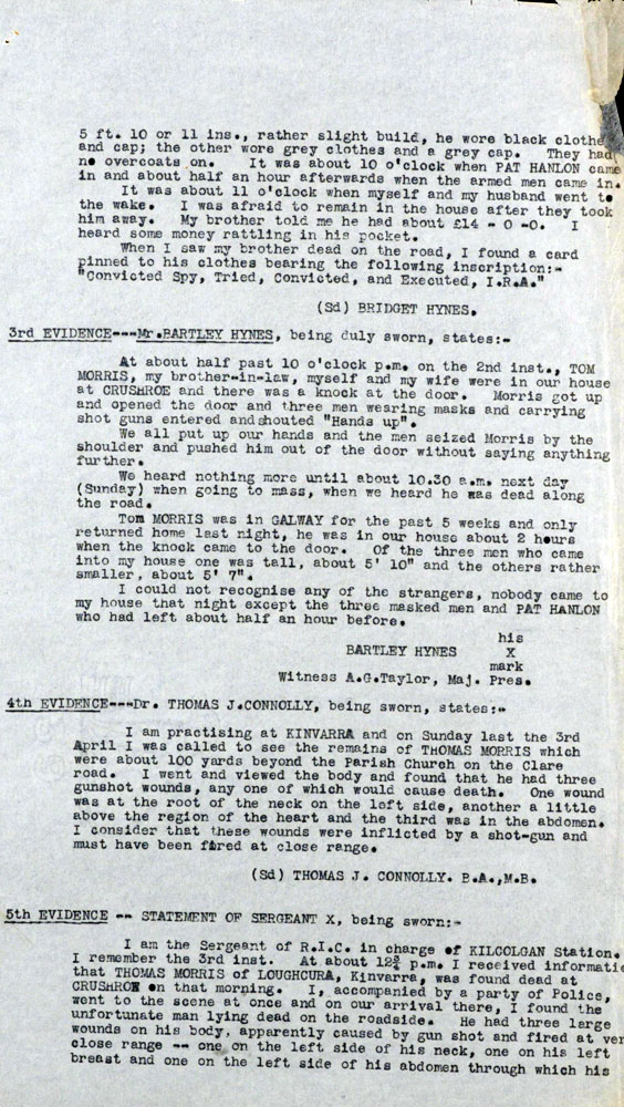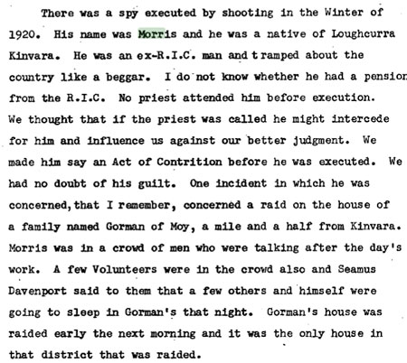 IRA Witness Statement One spy was executed in my area. His name was James Morris and he lived one mile from the town of Kinvara.Two further cases of suspected spying were also investigated but there was not sufficient proof in either case and they were dropped. None of the local R.I.C. was friendly. They all accompanied the Black and Tans and Auxiliaries on their raids.