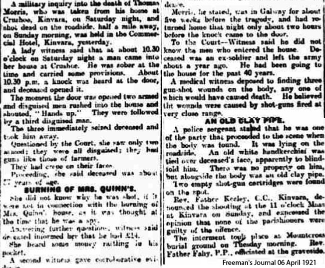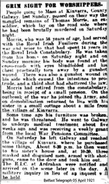 IRA Witness Statement At this time, in the Kinvara area it was proved to the I.R.A. that a man, named Morriss, was giving information to the barrack. A trap was set for him and he wa spromt1y executed by the Kinvar aCompany