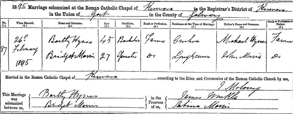 1895 His sister married in Kilvarra. Correct sister from her married name in Inquiry. Gives their father as John Morris